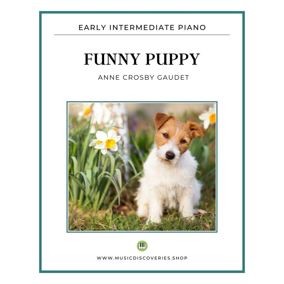 We even get some more of those whimsical tone clusters, and a few measures in 7-8, which sneak in some asymmetrical meter in a way students find completely delightful. Two early intermediate pieces, Periwinkle Twinkle, and Funny Puppy.